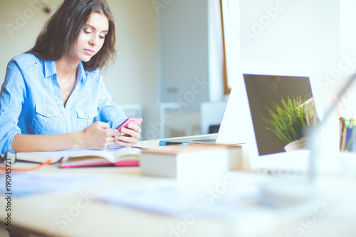Beautiful young business woman sitting at office desk and talking on cell phone. Business woman