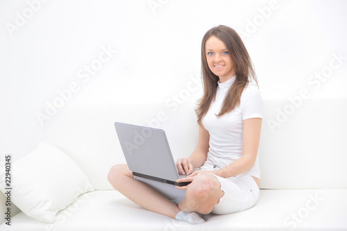 home, businesswoman, laptop, business, adult, attractive, background, beautiful, beauty, bright, tied-up, casual attire, caucasian, computer, couch, equipment, female, flower, fresh, girl, hold, house, human, lady, lifestyle, living, look, modern, new, paper, people, person, portrait, professional, room, to sit, sofa, study, technology, white, woman, work, young