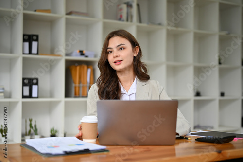 Beautiful young caucasian businesswoman sitting at her desk, looking away from camera