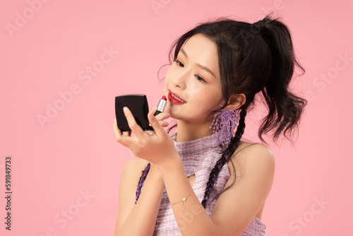 adolescence, applying, fashion, asia, asian, east asia, oriental, people, china, chinese, female, woman, adult, young adult, missy, one person, beautiful, well-being, cute, indoor, standing, holding, mirror, make-up, lipstick, cheerful, happiness, laughing, fun, freshness, purity, enjoyment, confidence, individuality, vitality, softness, change, horizontal, color image, photo, waist up, looking away