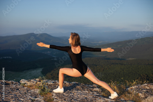 Beautiful young girl practicing joga. Antistress and mindfullness in a moment. Incredible view of mountains with green trees. Sunset time. Place for your text.