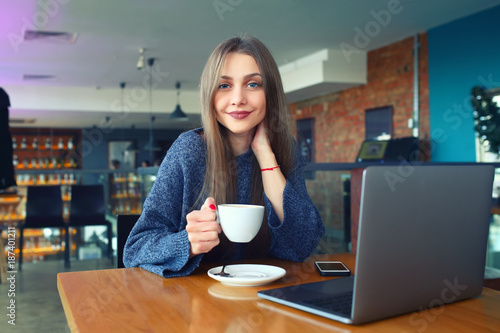 beautiful young girl resting in a cafe. Toned. Selective focus.