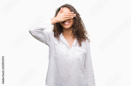 Beautiful young hispanic woman smiling and laughing with hand on face covering eyes for surprise. Blind concept.
