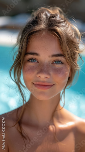 beautiful young smiling tanned woman against the background of a blue outdoor pool, summer, vacation, relax, girl, portrait, face, blue eyes, hotel, country club, spa