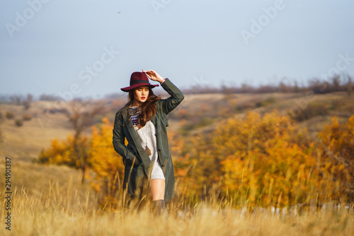 Beautiful young stylish girl in a coat walks in the autumn in the park. The girl is dressed in a green coat and a red hat. Beautiful evening. Autumn fashion. Lifestyle. High fashion portrait.