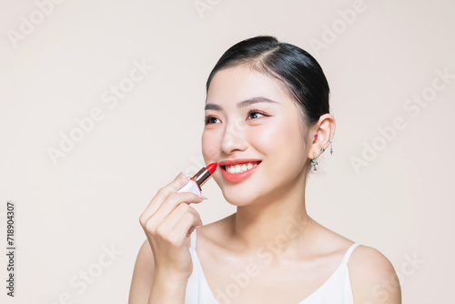 fashion, lip, face, portrait, model, beautiful, lipstick, skin, beauty, woman, make-up, care, female, young, luxury, lady, girl, cosmetic, stylish, bright, charming, mouth, health, attractive, pretty, applying, space, asian, vietnamese