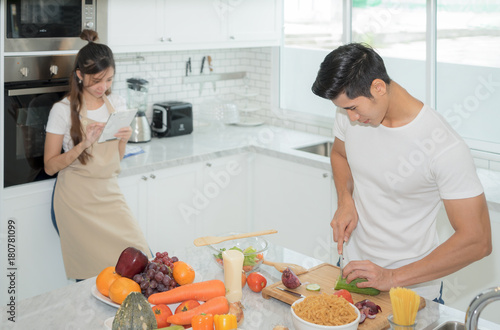 Beautiful young woman asian is using a digital tablet and smiling while her man is cooking in kitchen at home