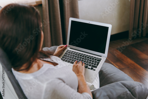 Beautiful young woman at home sitting on modern chair in front of window, relaxing in her living room and working with laptop. Close up. Back view. With place for text.