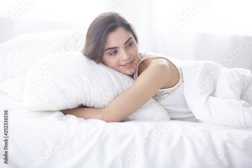 beautiful young woman basking in bed in the morning. Beautiful Model face looks sexy in camera
