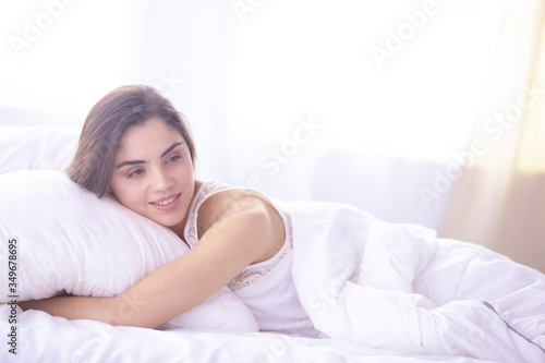 beautiful young woman basking in bed in the morning. Beautiful Model face looks sexy in camera