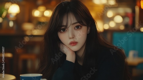 Beautiful young woman gazes thoughtfully into camera with soft lighting inside cafe.