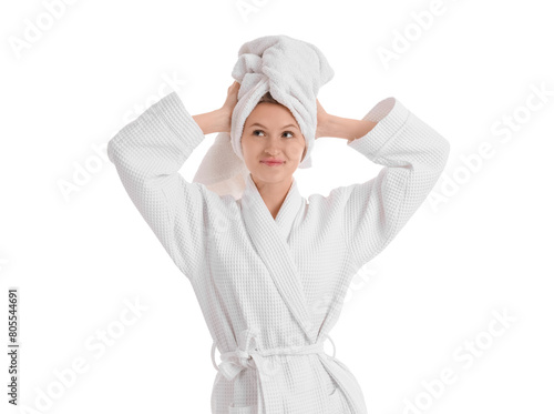 Beautiful young woman in bathrobe after shower isolated on white