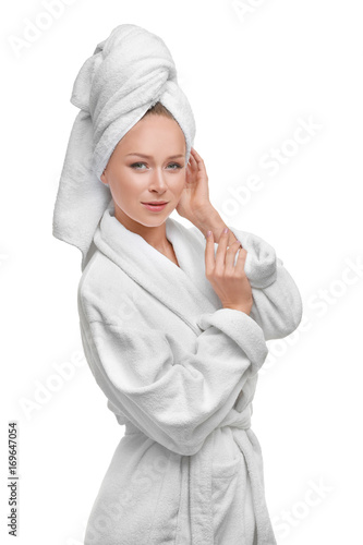 Beautiful young woman in bathrobe after shower on white background