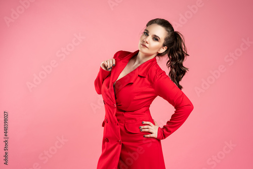 red, coat, woman, girl, fashion, model, dress, jacket, clothing, clothes, coiffure, hair, curly, ponytail, make-up, beauty, lady, wearing, wear, fashionable, feminine, portrait, beautiful, autumn, spring, fall, winter, season, cold, lifestyle, cute, elegance, long, elegant, attractive, style, pretty, stylish, sensuality, glamour, trendy, vogue, female, brunette, posing, young, studio, pink, background