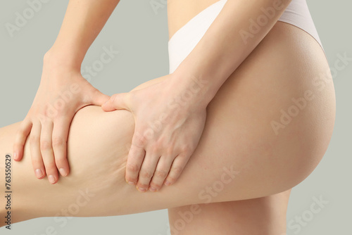Beautiful young woman in underwear with hips cellulite problem on grey background