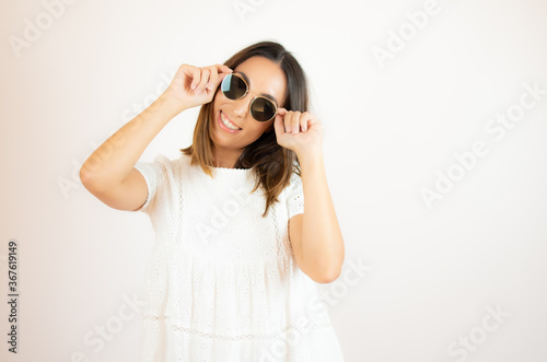 woman, young, girl, beautiful, casual attire, dress, colourful, smile, happy, emotion, professional, model, studio, advertisement, natural, vacation, resort, beach, sun, female, excitement, isolated, white, background, people, adult, great, showing, 1, surprised, gesture, idea, hispanic, excited, portrait, confident, vibe, travel, person, hand, advertisement, cute, funny, friendly, cruise, luxury, fun, holiday, sunglasses, elegant