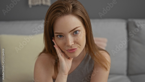 Beautiful young woman indoors with a redhead appearance posing attractively in a comfortable living room setting