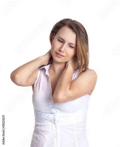 Beautiful young woman is experiencing pain in the neck. The emotions of the sick person.