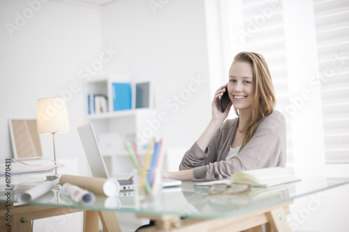 beautiful young woman on the workplace using his phone
