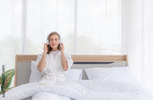 Beautiful young woman relaxing listening to music with earphones on the bed in the morning
