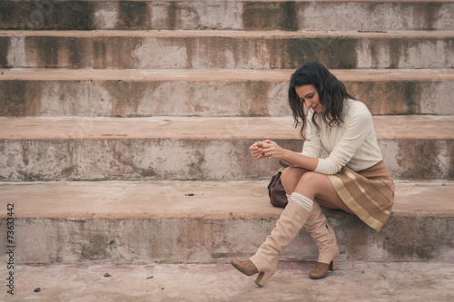 girl, beautiful, pretty, beauty, woman, attractive, young, fashionable, cute, lifestyle, fashion, caucasian, white, sensual, look, seductive, urban, people, style, stylish, female, street, lady, long, hair, posing, model, elegant, vogue, modern, contemporary, trendy, styling, outfit, autumn, fall, season, clothing, intense, expression, mini, skirt, miniskirt, brunette, concrete, step, leg, smiling