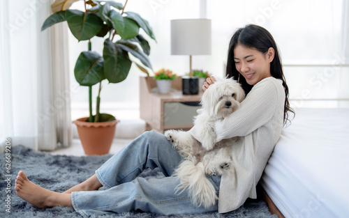 Beautiful young woman spends her free time on vacation playing with her beloved pet at home.