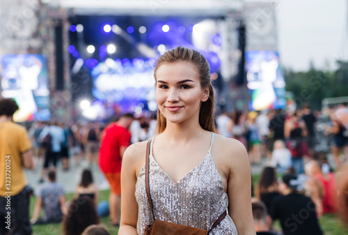 group, people, man, woman, boy, girl, male, female, adult, young, youth, event, together, celebration, joy, cool, happy, cheerful, excitement, enjoying, culture, performance, caucasian, friends, friendship, generation y, outdoors, outside, summer, festival, concert, uprising, music, casual attire, clothes, trendy, standing, front, view, waist up, dancing, stage, audience, beautiful, looking, camera