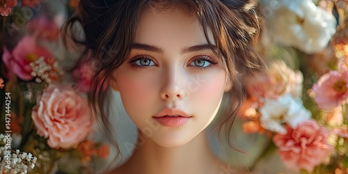 woman, girl, portrait, flower, pink, rose, beauty, face, model, skin, eye, blue, hair, brown, make-up, pretty, delicate, soft, gentle, floral, blossom, flower petals, romantic, feminine, elegant, graceful, serene, calm, peaceful, natural, light, sunlit, youthful, fresh, vibrant, bloom, spring, summer, dreamy, artistic, aesthetic, gorgeous