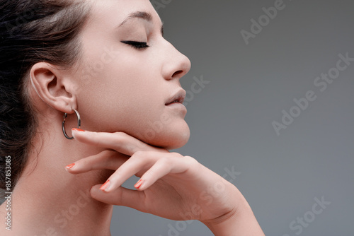 people, young adult, woman, beauty, portrait, young, beautiful, skin, eye, relaxation, cosmetic, closeup, freshness, wellness, elegance, glamour, nail polish, make-up, care, femininity, natural, content, chin, coiffure, youth, red, face, thought, satisfaction, grey background, enjoyment, lifestyle, feeling, closed, health, half face, peace, fashion, touching, harmony, earring, hand, pleasure, serenity, model, emotion, contemplation, sensuality, posing