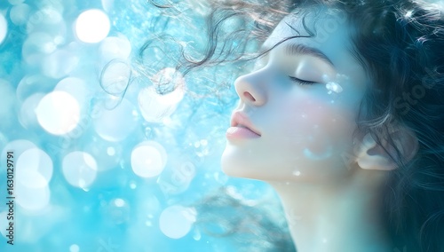 underwater, woman, girl, beauty, female, young, portrait, eye, closed, peaceful, serene, calm, tranquil, dreamy, aethereal, fantasy, magic, sparkling, light, bokeh, blue, water, swimming, diving, relaxation, hair, face, fashion, winter, model, make-up, glamour, people, christmas, person, lady, smile, make-up, cosmetic, skin, lip, summer, closeup, blond, cold, art, 1