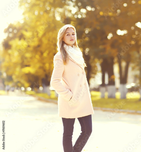 Beautiful young woman wearing a pink coat in sunny autumn park