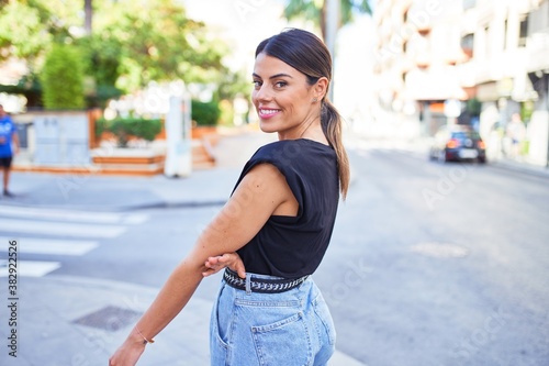 Beautiful young woman wearing fashionable clothes standing in the middle of the street at the town