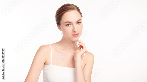 Beautiful young woman with clean fresh skin on white background, Face care, Facial treatment, Cosmetology, beauty and spa, women portrait.