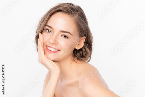 Beautiful young woman with clean fresh skin on white background, Face care, Facial treatment, Cosmetology, beauty and spa, women portrait