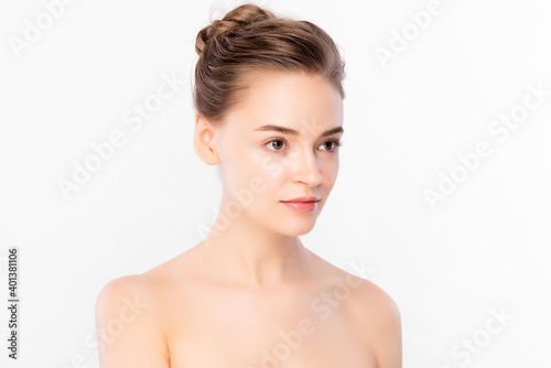 Beautiful young woman with clean fresh skin on white background, Face care, Facial treatment, Cosmetology, beauty and spa, women portrait