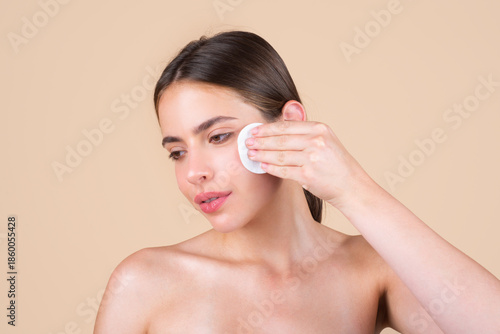 Beautiful young woman with cotton pad removing makeup. Skin care. Studio portrait of girl cleaning her face with cotton pad, isolated beige background. Face toner and cotton pad.