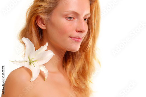 freckle, 20s, young, profile, red-haired, caucasian, hand, adult, lily, cute, attractive, beautiful, beauty, care, cheerful, clean, closeup, girl, cosmetic, face, fashion, flower, happiness, female, health, healthy, lifestyle, make-up, medicine, model, nature, natural, 1, person, portrait, floral, sensuality, skin, smiling, spa, well-being, woman, white, tender, alternative, holding, looking, isolated, background