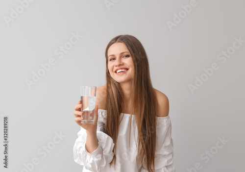 Beautiful young woman with glass of water on light background