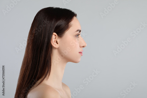 Beautiful young woman with healthy skin on light grey background. Space for text
