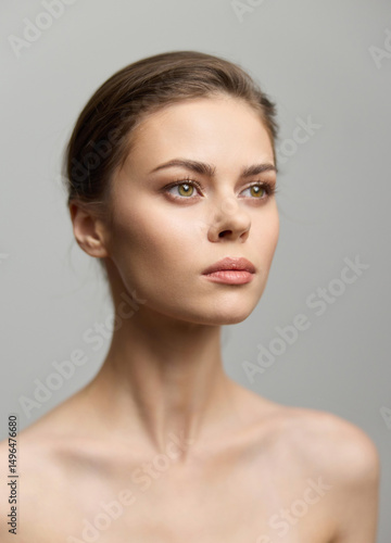 Beautiful young woman with long hair, gazing thoughtfully into the distance against a soft, neutral background. Portrait highlighting natural beauty and serenity.