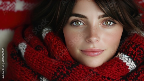 woman, girl, young, beautiful, pretty, face, portrait, closeup, eye, green eye, brown hair, winter, cold, cosy, foulard, knit up, red, red scarf, warm, comfortable, fashion, style, model, attractive, sensual, elegant, serene, peaceful, calm, happiness, content, make-up, natural beauty, winter fashion, textile, fabric, texture, detail