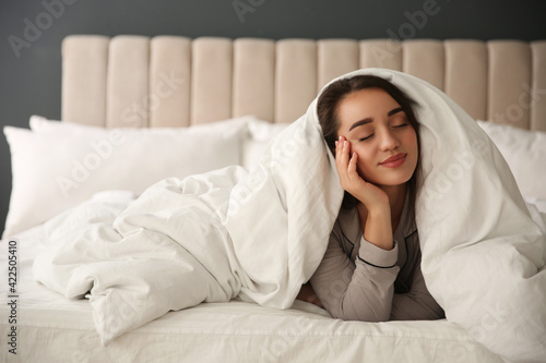 Beautiful young woman wrapped with soft blanket relaxing in bed at home