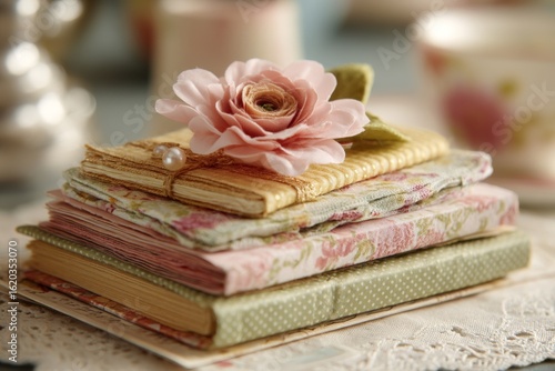 Beautifully arranged stack of decorative notebooks with pink flower on vintage lace