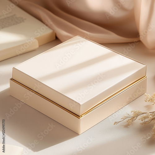 beautifully crafted dessert and cake packaging box in cream color, the inside part of the box is gold or rose gold material. The box should feature a minimalist and elegant design