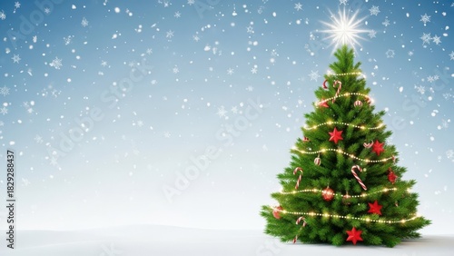 Beautifully decorated christmas tree with a shining star in a snowy winter scene