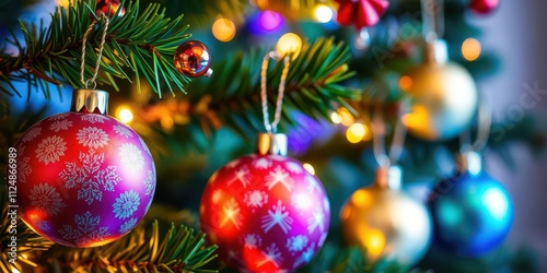 Beautifully decorated Christmas tree with colorful ornaments, lights, and a shining star on top, colorful, cheerful, baubles