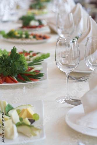 dish, tablecloth, vegetarian, decoration, meal, table, nobody, vegan, plate, white, clothes, drink, silverware, reception, luxury, crockery, eatery, setting, wine, waiter, banquet, elegant, equipment, napkin, dinner, tidy, lunch, knife, interior, maintenance, birthday, set, wedding, dining, fork, food, wine glass, glasses