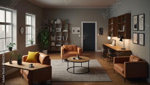 living room, furniture, decor, cosy, elegant, contemporary, comfortable, interior design, home, stylish, room, shelf, plant, table, chair, sofa, rug, artwork, painting, lamp, book, bookcase, workspace, office, study, home office, wood, window, natural light, minimalist, design, aesthetic, architecture, layout, relaxing, home decor, indoor, apartment