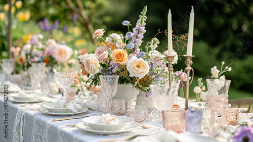 Beautifully set table for a garden party, adorned tablescape with vibrant floral arrangements, under the shade of blossoming rose bushes, inviting a sense of elegance and natural charm