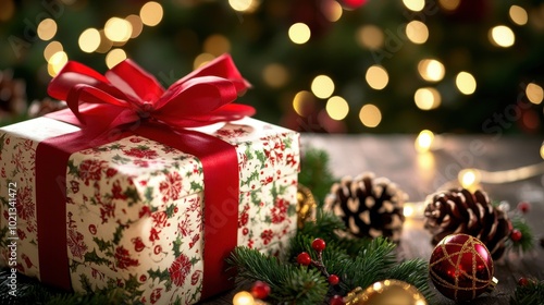 gift, christmas, holiday, wrapping, ribbon, decoration, table, bokeh, pine, ornament, festive, celebration, surprise, seasonal, present, red, green, shiny, square, wooden, arrangement, cosy, bright, joy, happiness, warmth, cheer, family, love, tradition, beauty, nature, texture, elegance, style, decor, background, soft, light, sparkle, detail, luxury, moment, still life, peace, calmness